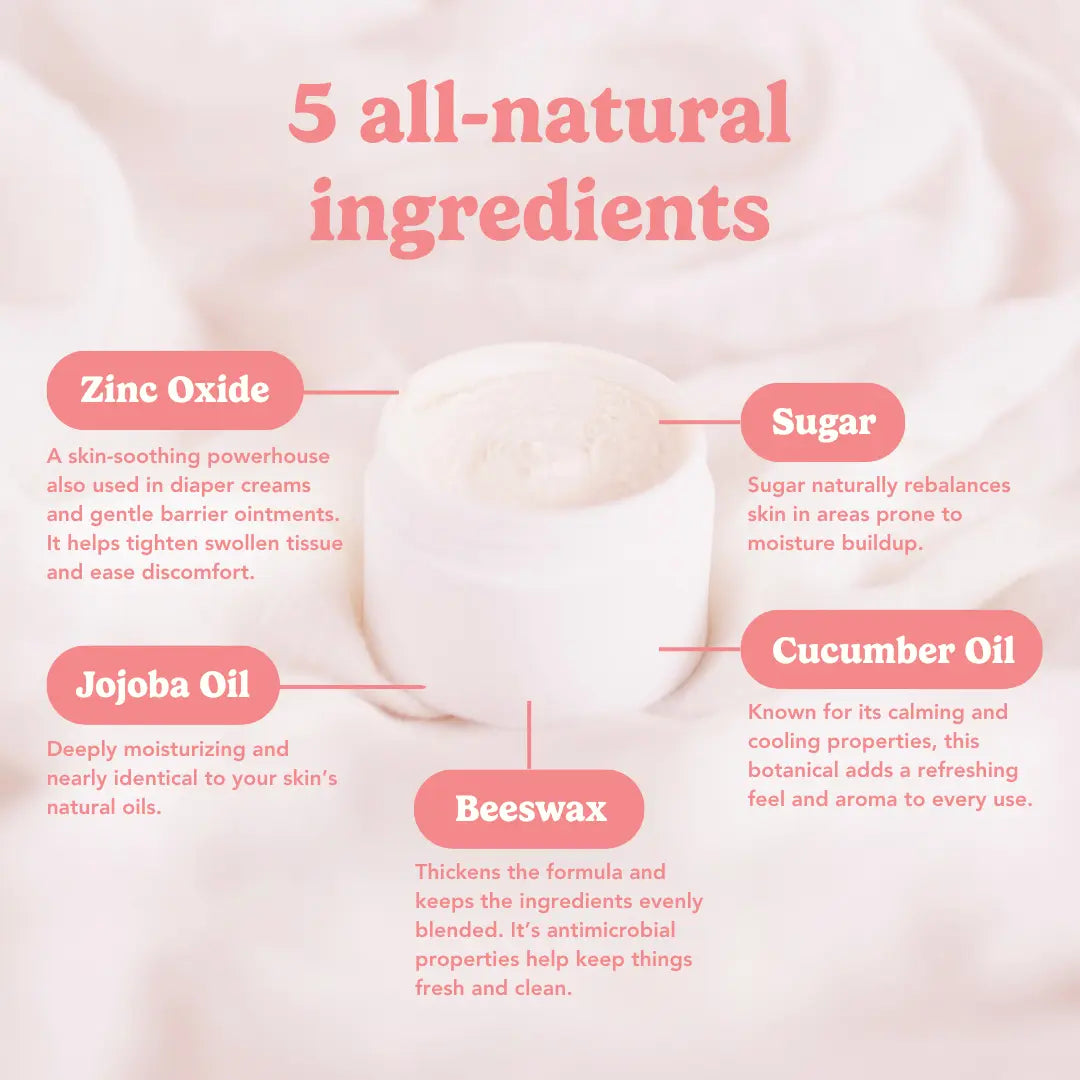 As the balm absorbs, zinc oxide and sugar help reduce swelling, rebalance moisture, and relieve pressure at the source. The included dry cloth holds the balm in place, locking in comfort for longer-lasting relief and keeps your underwear clean.
